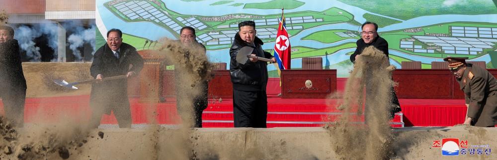 When Kim Jong Un finished his rallying speech, all the builders raised the stormy